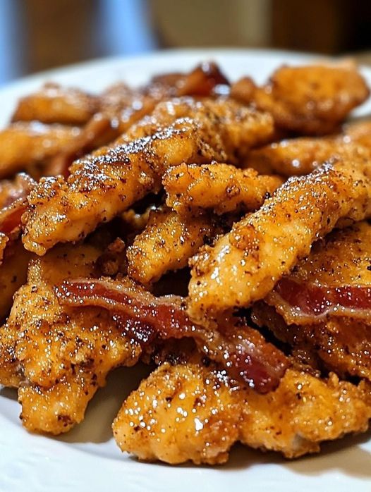 Evenly distribute the crumbled bacon pieces on top of the seasoned chicken tenders for an extra layer of flavor and crunch.