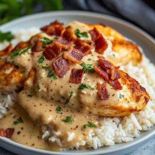 - Spoon the cooked white rice onto each plate, place a smothered chicken breast on top, and garnish with crumbled bacon and fresh parsley if desired. Enjoy!